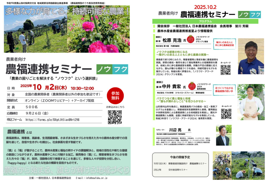 セミナーのお問い合わせ先:一般社団法人 日本農福連携協会 e-mail info@noufuku.or.jp